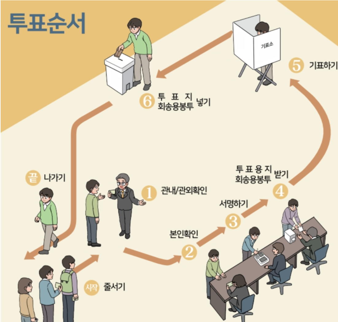 ① 신분증 제시 → ② 본인확인 및 서명/도장 → ③ 투표용지 수령 → ④ 기표소에서 투표 → ⑤ 투표함에 넣기